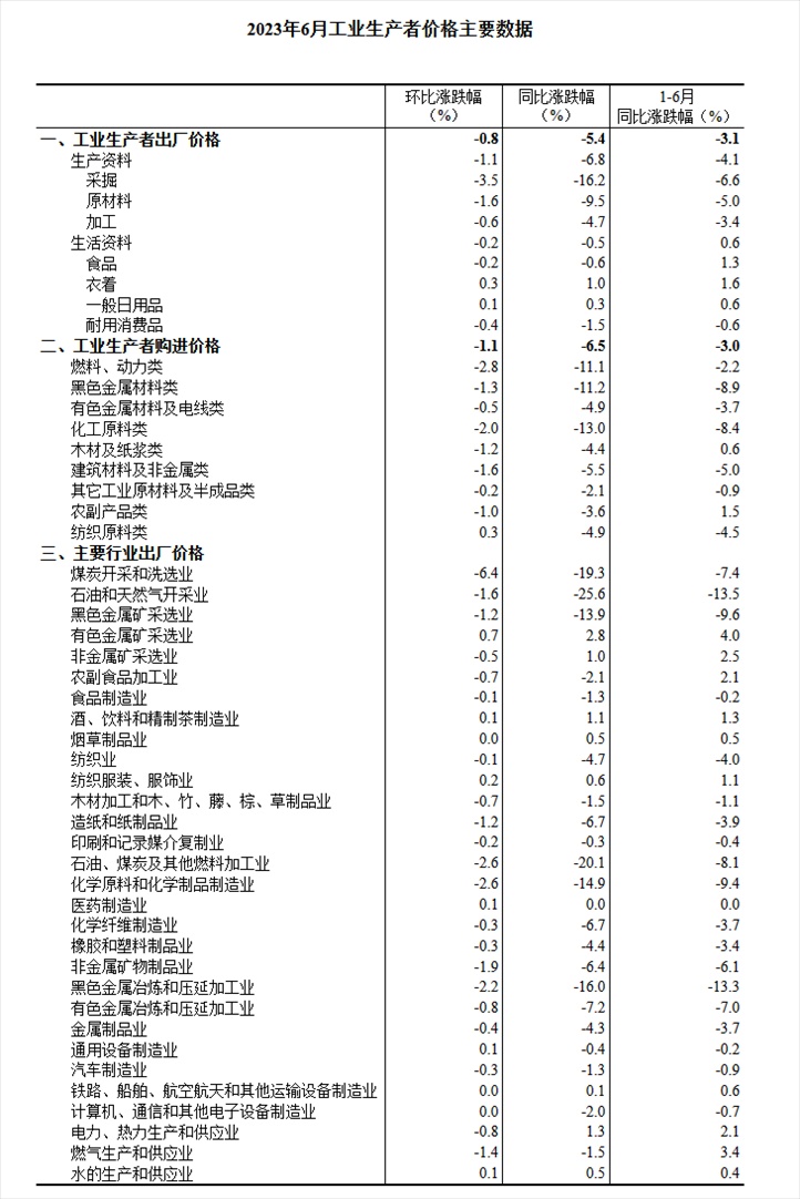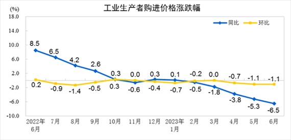 央視網(wǎng)消息:據(jù)國(guó)家統(tǒng)計(jì)局網(wǎng)站消息,2023年6月份,全國(guó)工業(yè)生產(chǎn)者出廠(chǎng)價(jià)格同比下降5.4%,環(huán)比下降0.8%;工業(yè)生產(chǎn)者購(gòu)進(jìn)價(jià)格同比下降6.5%,環(huán)比下降1.1%。上半年,工業(yè)生產(chǎn)者出廠(chǎng)價(jià)格比上年同期下降3.1%,工業(yè)生產(chǎn)者購(gòu)進(jìn)價(jià)格下降3.0%。