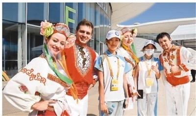 近日,上海合作組織國際投資貿易博覽會在青島舉行,促進了國際間科技、經(jīng)濟和文化交流。圖為來自白俄羅斯的客人與博覽會志愿者合影。