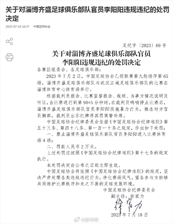 ·中國(guó)足協(xié)再開罰單,兩名俱樂部官員因違規(guī)違紀(jì)被罰。