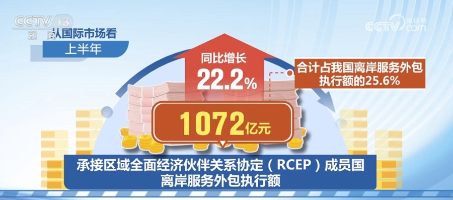 從國際市場看,上半年,承接區(qū)域全面經(jīng)濟(jì)伙伴關(guān)系協(xié)定(RCEP)成員國離岸服務(wù)外包執(zhí)行額1072億元,同比增長22.2%,合計占我國離岸服務(wù)外包執(zhí)行額的25.6%。