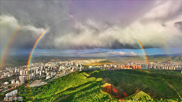 青海省西寧市一場云雨過后,天空出現雙彩虹。