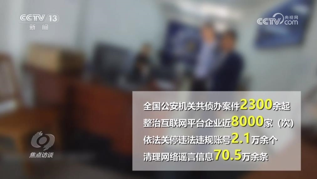 今年4月以來,公安部網(wǎng)安局部署開展為期100天的網(wǎng)絡(luò)謠言打擊整治專項(xiàng)行動(dòng),全國公安機(jī)關(guān)共偵辦案件2300余起,整治互聯(lián)網(wǎng)平臺(tái)企業(yè)近8000家(次),依法關(guān)停違法違規(guī)賬號(hào)2.1萬余個(gè),清理網(wǎng)絡(luò)謠言信息70.5萬余條,對(duì)網(wǎng)絡(luò)謠言違法犯罪形成強(qiáng)大震懾。