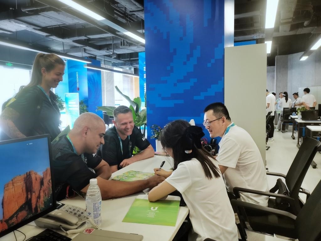 國外大學(xué)生代表團(tuán)成員在成都大運(yùn)村咨詢城市文化體驗(yàn)觀光線路活動。受訪者供圖
