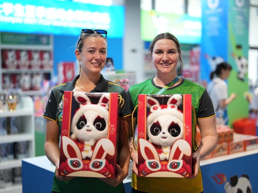 蘇珊(左)和隊友展示剛剛買到的兔年版“蓉寶”。新華社記者 鄭直 攝