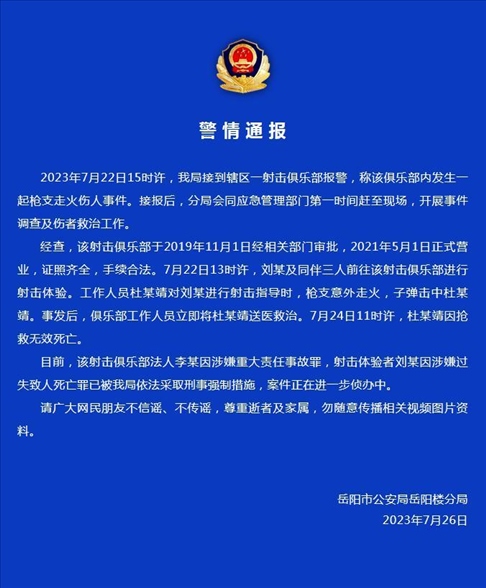·岳陽警方通報(bào)一俱樂部槍支走火致工作人員死亡事件。