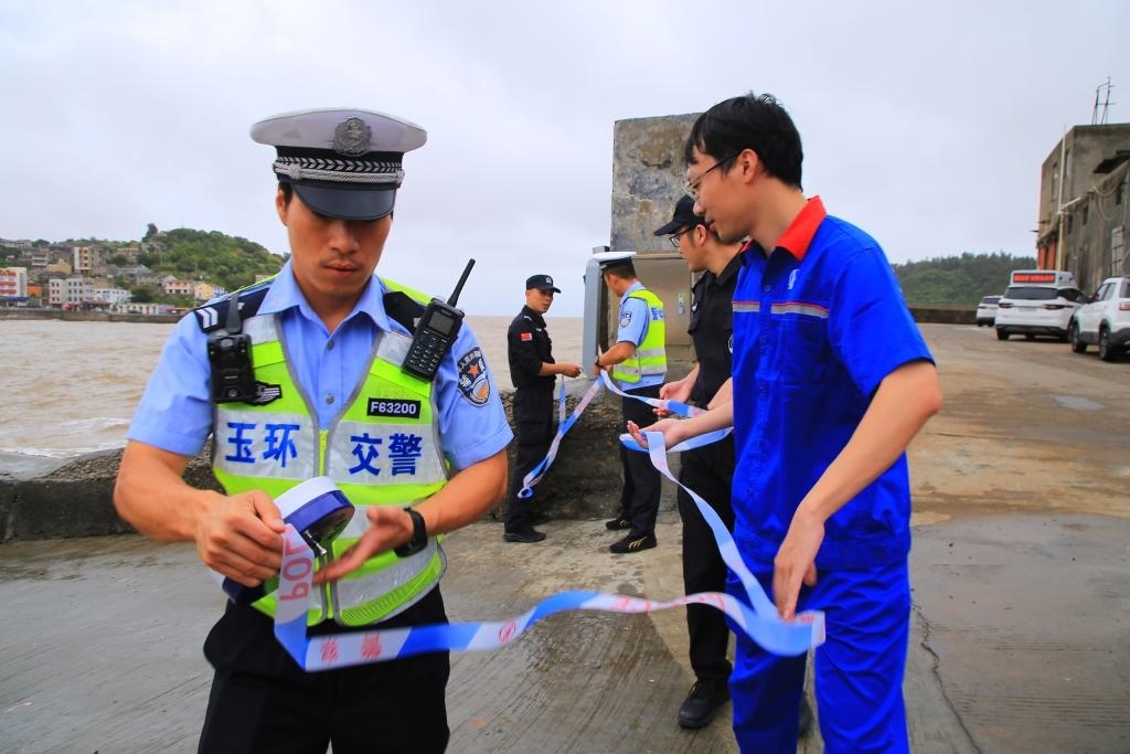7月27日,民警、交警在浙江省玉環(huán)市應(yīng)東碼頭設(shè)置警戒線。新華社發(fā)(段俊利攝)