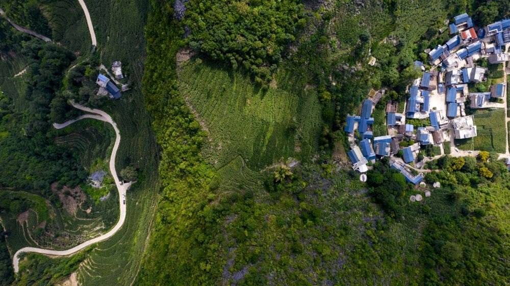 這是7月26日拍攝的西疇縣山間公路,右側(cè)這條是巖頭村村民小組長李華明帶領(lǐng)群眾修建的最后一公里進村道路。新華社記者 陳欣波 攝