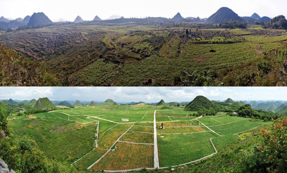 拼版照片:上圖為1991年拍攝的西疇縣大鄔麻村改造前的石漠化情況(西疇縣融媒體中心供圖);下圖為2023年7月26日拍攝的西疇縣大鄔麻村改造后的情況(新華社記者 費茂華 攝)。