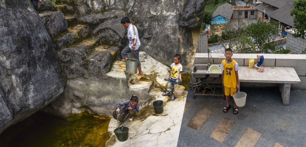 拼版照片:左圖為2014年拍攝的西疇縣巖頭村村民在石頭凹里取水,這些水是下雨時積的,當(dāng)時小村民李大鑫(右)只有5歲(西疇縣融媒體中心供圖);右圖為2023年7月26日拍攝的西疇縣巖頭村村民李大鑫在自己家的院子里接自來水(新華社記者 費茂華 攝)。
