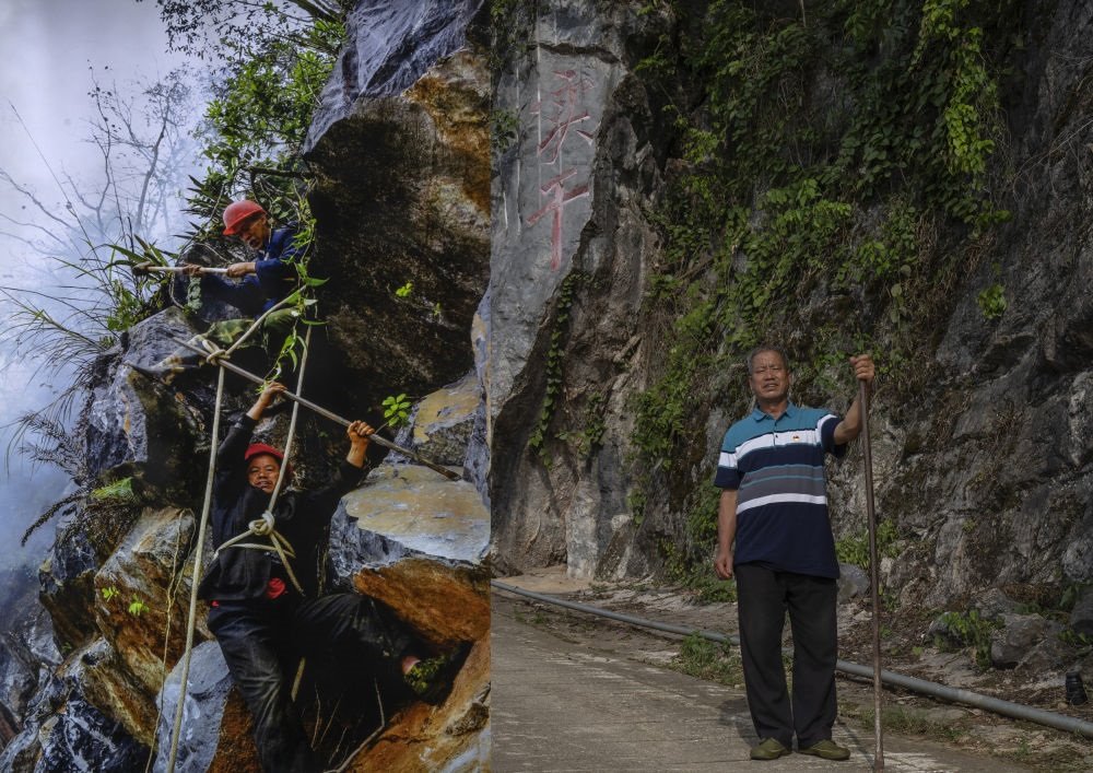 拼版照片:左圖為2008年李華明(下)和同伴在修路時在懸崖上打炮眼的資料照片(西疇縣融媒體中心供圖);右圖為2023年7月26日李華明在修好的出村路上留影(新華社記者 費茂華 攝)。