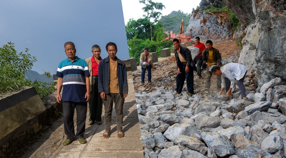 拼版照片:左圖為2009年謝成芬(前左)帶領(lǐng)村民一起修路時的資料照片(西疇縣融媒體中心供圖);右圖為2023年7月27日,謝成芬站在修好的出村公路上(新華社記者 費茂華 攝)。