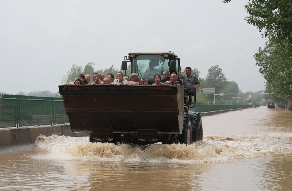 7月31日,在河北省邢臺市寧晉縣,救援人員使用工程機械設(shè)備轉(zhuǎn)運北沙良村村民。新華社記者 楊世堯 攝