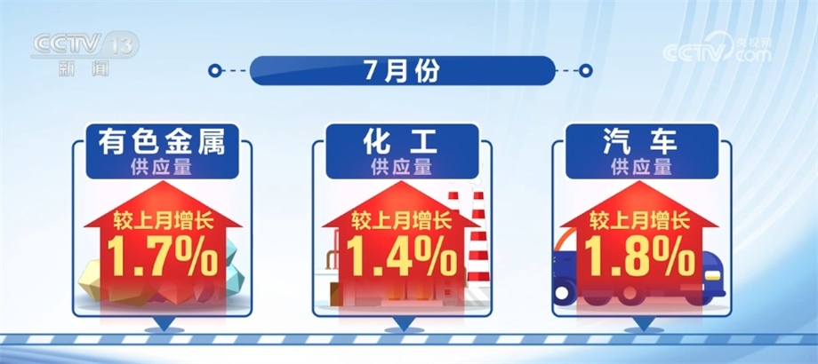 7月份,鋼鐵、煤炭和成品油供應(yīng)量較上月分別增加4.6%、7.3%和4.1%,增速較上月分別加快1.4、1.1和1.3個(gè)百分點(diǎn)。有色金屬、化工和汽車供應(yīng)量較上月分別增長1.7%、1.4%和1.8%。