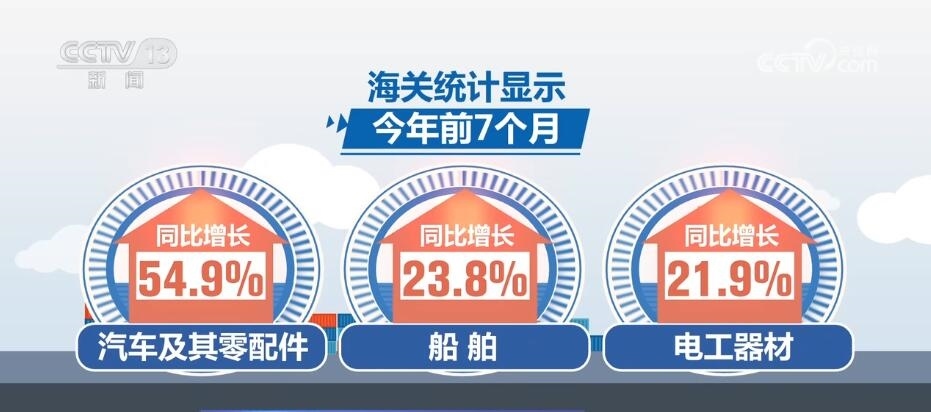 海關(guān)統(tǒng)計(jì)顯示,今年前7個(gè)月,我國(guó)機(jī)電產(chǎn)品出口占比提升,汽車及其零配件、船舶、電工器材同比分別增長(zhǎng)54.9%、23.8%、21.9%。