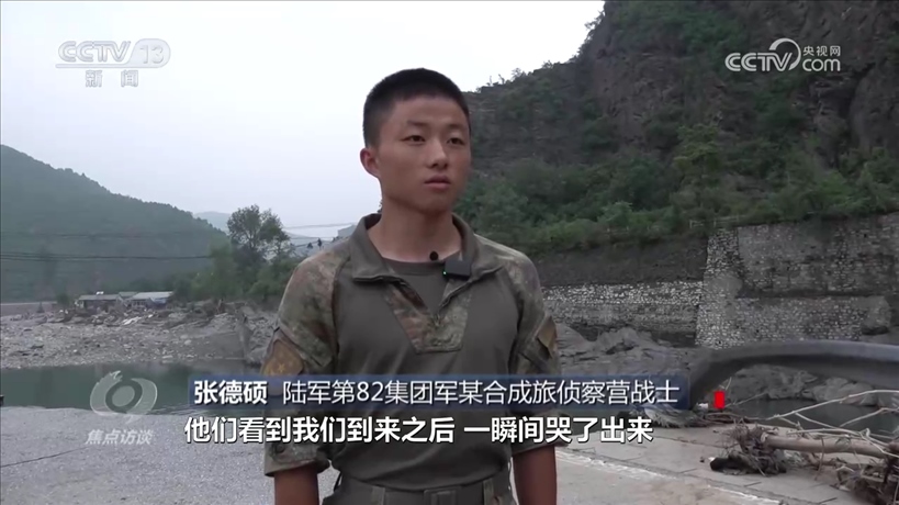 受強降雨影響,8月1日房山區(qū)108國道周邊25個村莊斷聯(lián),陸軍第82集團軍某合成旅臨危受命,8月3日清晨6點,緊急派出30余名偵察兵探尋斷聯(lián)村莊。沿途道路受山洪影響嚴重,多處中斷,車輛無法通行。偵察兵們攜帶衛(wèi)星電話、無人機、繩索等器材徒步前進,經過4個小時左右,11名偵察兵抵達斷聯(lián)村莊楊林水村。村里的房屋損毀嚴重,路被沖毀,單個人通行都特別困難,沒水沒電沒網。