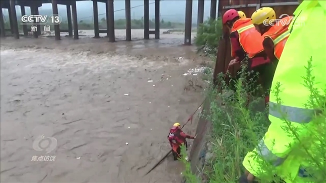 洪流一度沒過車頂,被困人員憑借著頑強的求生意識將頭伸出車外。現(xiàn)場指揮員立即更改作戰(zhàn)方案,協(xié)調起吊車等工程車輛協(xié)助救援。