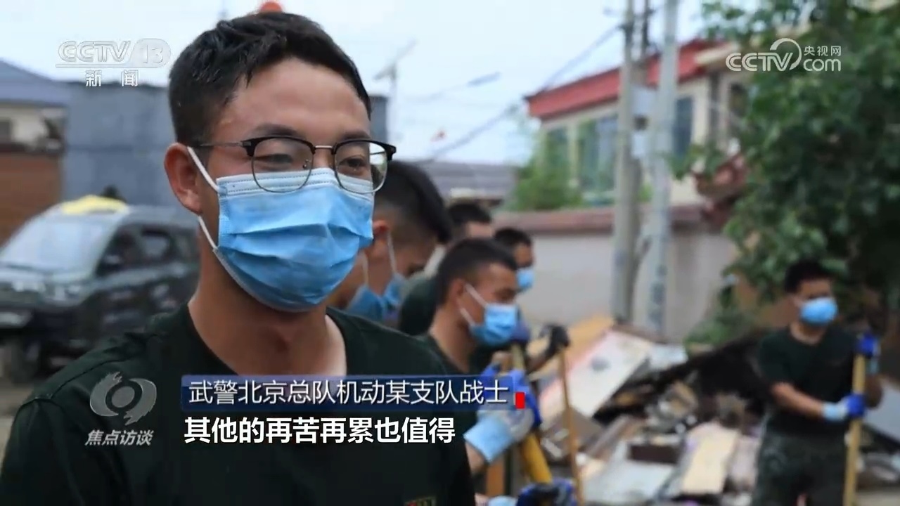 從7月31日接到命令以來,武警北京總隊機動某支隊就派出1450人奮戰(zhàn)在一線,前期參與救援,現(xiàn)在是災后清淤,每天都要工作十小時以上。