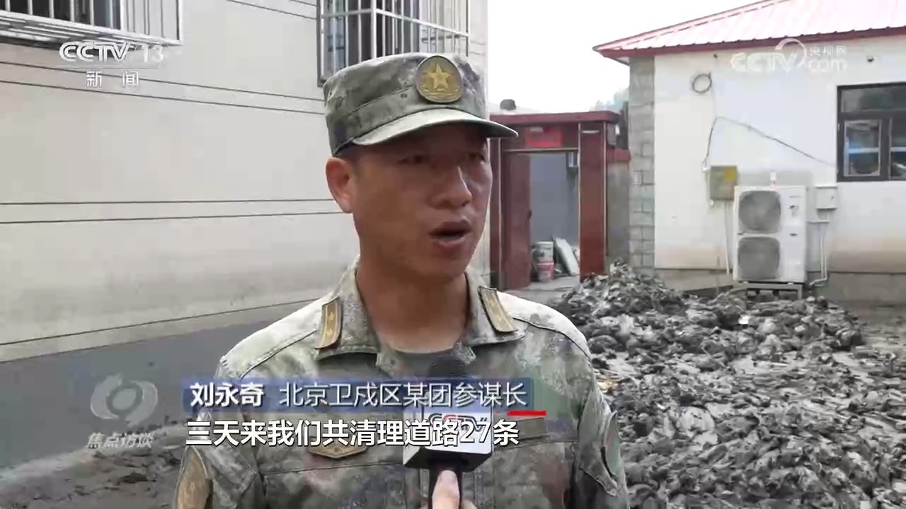 北京衛(wèi)戍區(qū)某團參謀長劉永奇:“三天來,我們共清理道路27條,面積28000余平方米,淤泥700余立方米,廢舊垃圾1300余立方米,全面疏通了各條道路。”