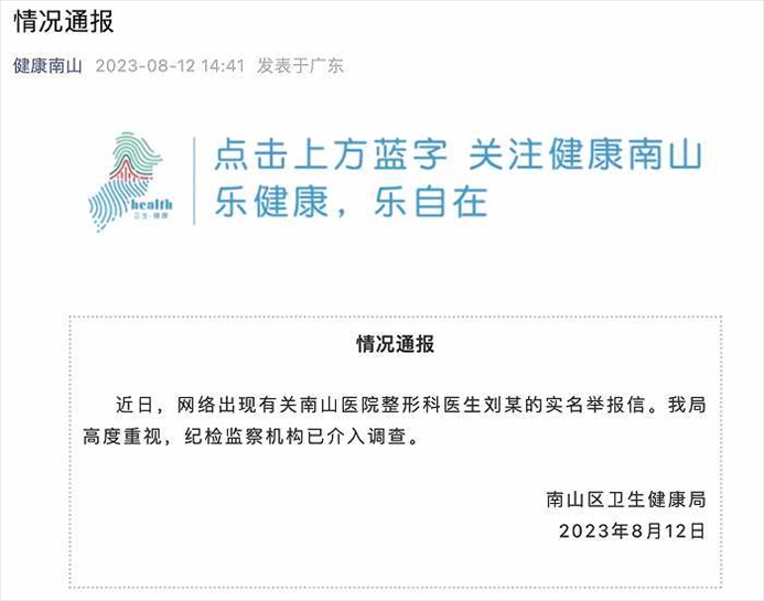 ·網(wǎng)傳南山醫(yī)院整形科醫(yī)生劉某被實(shí)名舉報(bào),官方通報(bào):紀(jì)檢監(jiān)察機(jī)構(gòu)已介入調(diào)查。