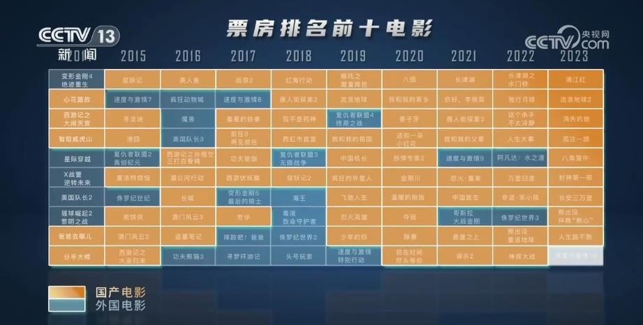 央視網消息:國家電影局最新發(fā)布統(tǒng)計數據顯示,2023年暑期檔電影票房已達178億元,超過2019年暑期檔總票房,創(chuàng)歷史新高。是什么點燃了觀眾對電影的熱情? 通過對近10年票房前10名的電影片尾字幕提取,用數據洞察國產電影的發(fā)展。