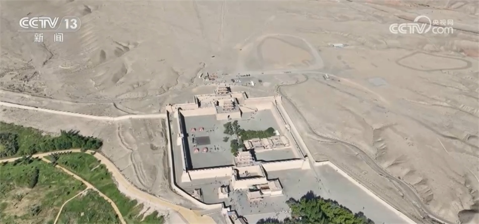 總臺記者 王妍:來到這兒的人,一定會有一個和我一樣的疑問,那就是嘉峪關(guān)為何要選址在此?我們在空中會有一個直觀的視角,從這里向南7公里是祁連山,向北8公里就是黑山,關(guān)內(nèi)恰有一灣“九眼泉湖”,可供兵馬飲用。真正可以說是絕佳的依山筑防、臨水設(shè)險之地。