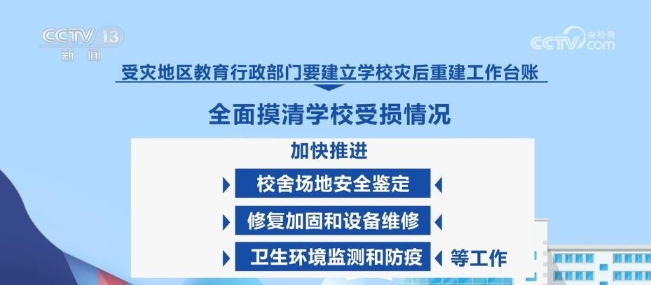 教育部強(qiáng)調(diào),要慎終如始做好災(zāi)后恢復(fù)重建各項(xiàng)工作,穩(wěn)慎做好受災(zāi)師生安置慰問、補(bǔ)償救助等工作。受災(zāi)地區(qū)教育行政部門要建立學(xué)校災(zāi)后重建工作臺(tái)賬,全面摸清學(xué)校受損情況,加快推進(jìn)校舍場(chǎng)地安全鑒定、修復(fù)加固和設(shè)備維修、衛(wèi)生環(huán)境監(jiān)測(cè)和防疫等工作。確實(shí)在開學(xué)前不能完成災(zāi)后重建的,要立足實(shí)際采取臨時(shí)轉(zhuǎn)移就學(xué)等舉措,全力保障正常開學(xué)。各地各校要一體推進(jìn)防汛救災(zāi)和校園安全治理,健全校園安全常規(guī)檢查機(jī)制,持續(xù)深入排查整治風(fēng)險(xiǎn)隱患,有效防范原發(fā)、誘發(fā)性自然災(zāi)害和次生安全風(fēng)險(xiǎn)。