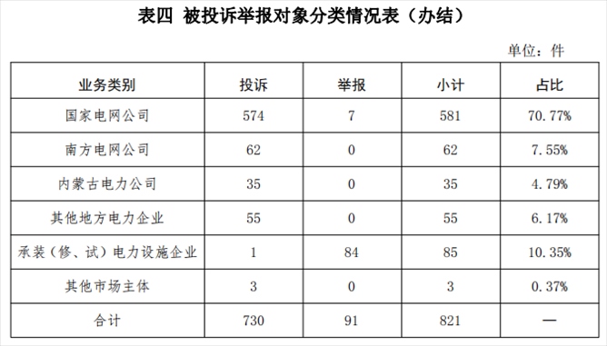 從被投訴舉報對象看,供電企業(yè)733件、占投訴舉報總數(shù)的89.28%,其中國家電網(wǎng)公司581件、占比70.77%,南方電網(wǎng)公司62件、占比7.55%,內(nèi)蒙古電力公司35件、占比3.65%,其他地方電力企業(yè)55件、占比6.17%;承裝(修、試)電力設施企業(yè)85件、占比10.35%;其他市場主體3件、占比0.37%。