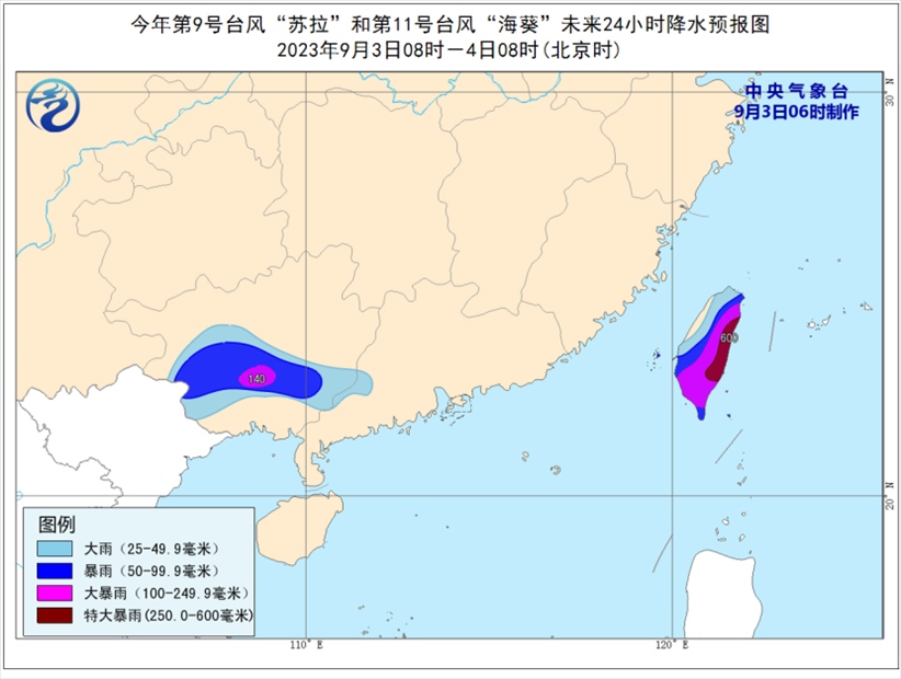 降水預(yù)報(bào):9月3日08時(shí)至4日08時(shí),受“蘇拉”和“??庇绊?,廣西中南部、廣東西南部、臺(tái)灣島等地部分地區(qū)有大到暴雨,其中,廣西中南部、臺(tái)灣島中東部等地部分地區(qū)有大暴雨,臺(tái)灣島東部部分地區(qū)有特大暴雨(250-600毫米)。