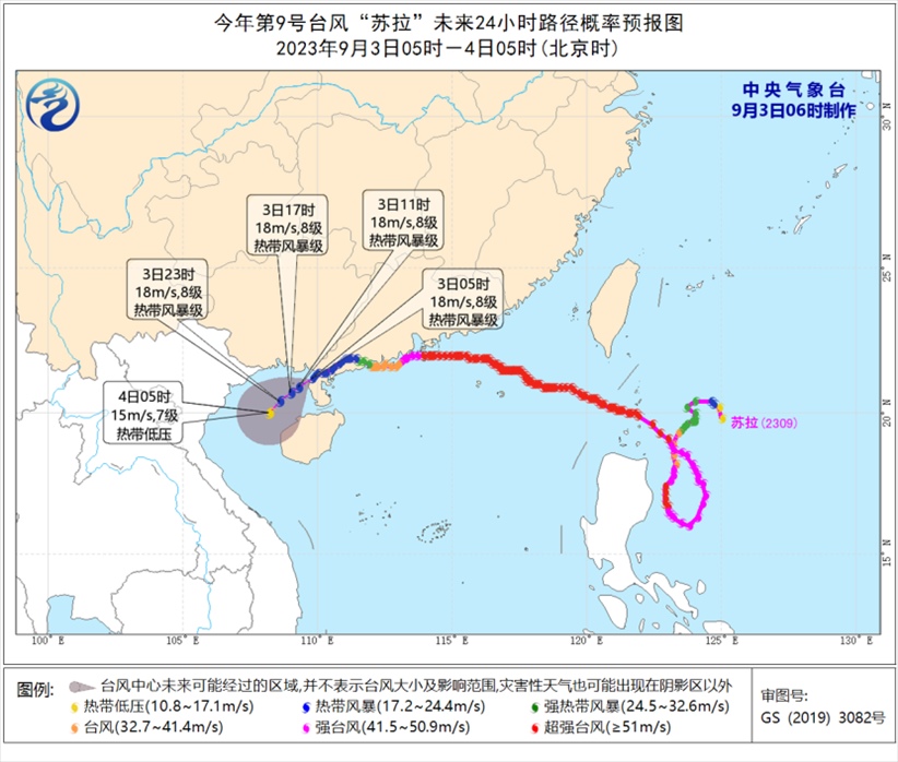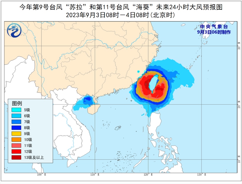 大風(fēng)預(yù)報(bào):9月3日08時(shí)至4日08時(shí),受“蘇拉”影響,北部灣、瓊州海峽以及廣西南部沿海、海南島北部沿海等地將有6-7級(jí)大風(fēng),其中北部灣部分海域?qū)⒂?級(jí)、陣風(fēng)9-10級(jí)的大風(fēng);受“??庇绊?,巴士海峽、臺(tái)灣海峽、臺(tái)灣以東洋面、東海南部及釣魚(yú)島附近海域以及浙江南部沿海、福建沿海、臺(tái)灣島沿海將有6-8級(jí)、陣風(fēng)9-10級(jí)大風(fēng),部分海域或地區(qū)的風(fēng)力有9-12級(jí),陣風(fēng)13-14級(jí),“??敝行慕?jīng)過(guò)的附近海面或地區(qū)的風(fēng)力有13-16級(jí),陣風(fēng)17級(jí)。