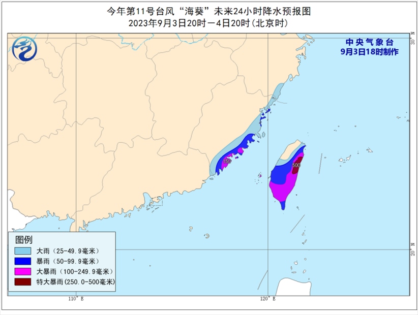 降水預(yù)報(bào):9月3日20時至4日20時,福建東部、浙江東南部沿海、臺灣島等地有大到暴雨,其中,福建東南部沿海、臺灣島東部和南部等地部分地區(qū)有大暴雨,臺灣島東部局地特大暴雨(250~500毫米);上述地區(qū)最大小時降雨量20~50毫米,局地可超過60毫米,局地還有雷暴大風(fēng)等強(qiáng)對流天氣。
