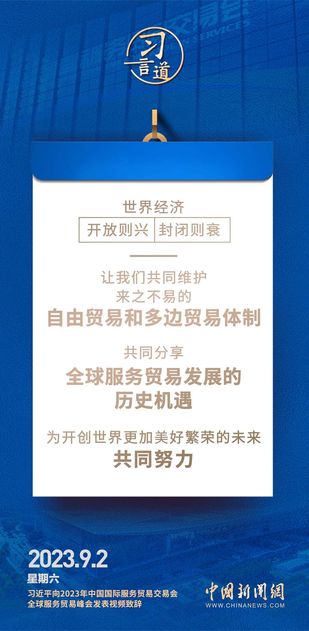 9月2日上午,國家主席習(xí)近平在北京向2023年中國國際服務(wù)貿(mào)易交易會(huì)全球服務(wù)貿(mào)易峰會(huì)發(fā)表視頻致辭。習(xí)近平指出——