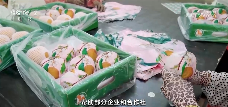 在當?shù)匾患液献魃?,記者看到,工人們正在分揀果子,套袋裝箱,這些秋月梨將銷往全國各地。