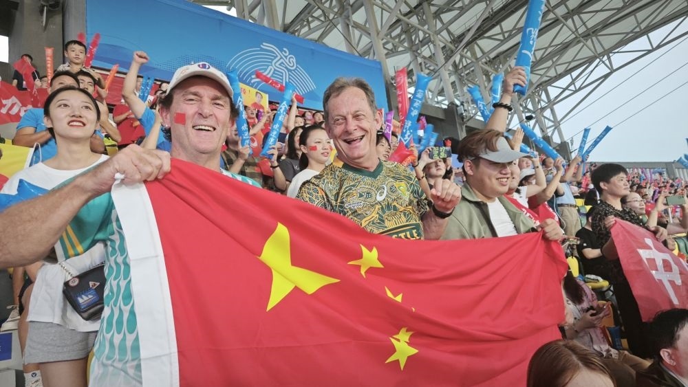 埃里克(左)和本展示五星紅旗,為中國隊加油