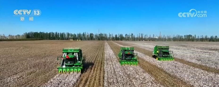 瑪納斯縣南靠天山山脈,土壤肥沃,光熱水土資源豐富,適宜種植棉花,是新疆的重要棉花產(chǎn)區(qū),也是國家級優(yōu)質(zhì)商品棉生產(chǎn)基地,今年當(dāng)?shù)孛藁ǚN植面積74萬畝。在瑪納斯縣涼州戶鎮(zhèn)呂家莊村的萬畝棉田里,三臺新引進(jìn)的棉花采收打包一體機(jī)正在采收棉花,采棉機(jī)能夠高效快速地將棉花從棉稈上脫離,采凈率高達(dá)95%以上,一臺采棉機(jī)平均每天可采收700多畝棉花,相當(dāng)于1000名拾花工勞動量的總和。