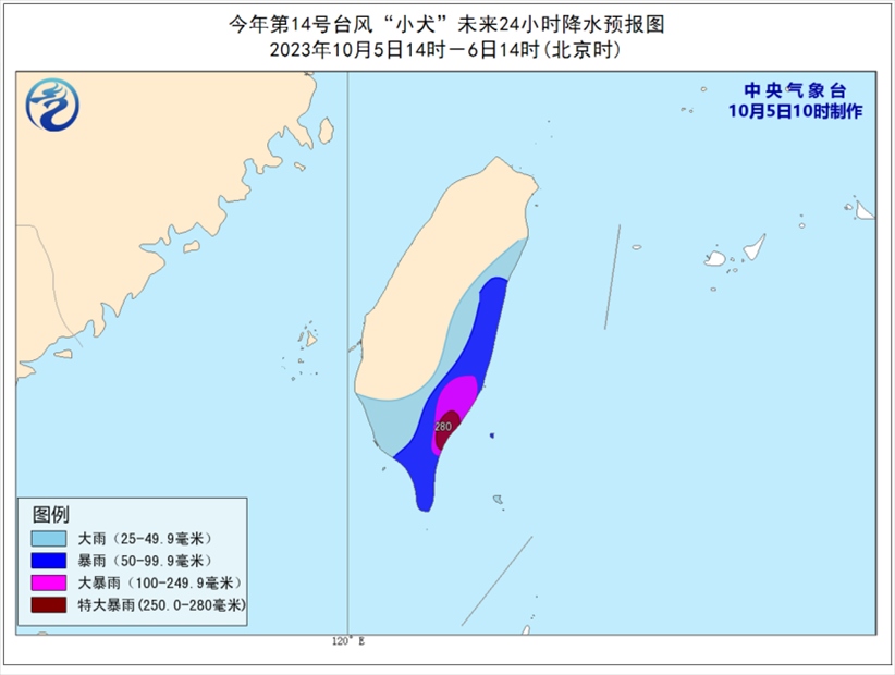 降水預報:5日14時至6日14時,臺灣島東部和南部有大到暴雨,臺灣島東南部部分地區(qū)有大暴雨,局地特大暴雨(250-280毫米)。