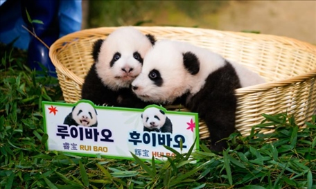 ·旅韓大熊貓雙胞胎幼崽“睿寶”“輝寶”首次公開露面。