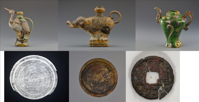 一號沉船遺址有多個隔艙的船貨堆積,包括陶器、瓷器、銅器、鐵器、竹木器等,數(shù)量超十萬件,代表性器物有醬釉陶罐,琺華梅瓶,青花執(zhí)壺、玉壺春瓶,紅綠彩碗、盤、杯,青釉玉壺春瓶,青白釉盤、碗,白釉三足圓香爐,藍(lán)釉高足碗,單色釉玉壺春瓶、扁壺,素三彩螺形壺、象形壺、鶴形壺,鐵鍋,銅盤、銅錢等。二號沉船遺址發(fā)現(xiàn)大量尺寸相近、碼放整齊的原木及少量陶器、瓷器、蠑螺殼等。