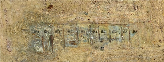 一號沉船遺址由核心區(qū)、環(huán)形散落區(qū)和條形散落區(qū)組成,年代為明正德年間。核心區(qū)為船體和大量堆疊有序、碼放整齊的陶瓷器、鐵器等構(gòu)成的堆積,長約37米,寬約11米,環(huán)形散落區(qū)、條形散落區(qū)由散落的船載物品構(gòu)成,遺物較少。一號沉船上部結(jié)構(gòu)不存,殘存船體大部分被掩埋覆蓋,僅在部分位置暴露有隔艙板和底板。