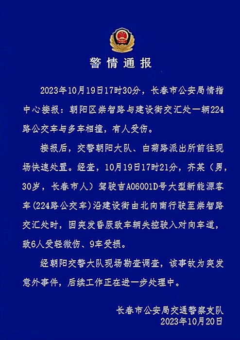 ·長春交警通報(bào)公交車與多車相撞:30歲司機(jī)突發(fā)昏厥致車輛失控,6人輕微傷。