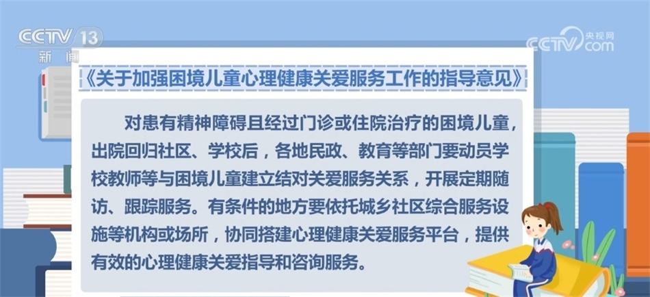 央視網(wǎng)消息:近日,民政部等五部門聯(lián)合印發(fā)《關(guān)于加強(qiáng)困境兒童心理健康關(guān)愛(ài)服務(wù)工作的指導(dǎo)意見(jiàn)》,通過(guò)加強(qiáng)心理健康教育、開(kāi)展心理健康監(jiān)測(cè)等措施,全面提升困境兒童心理健康水平和身心健康素質(zhì)。