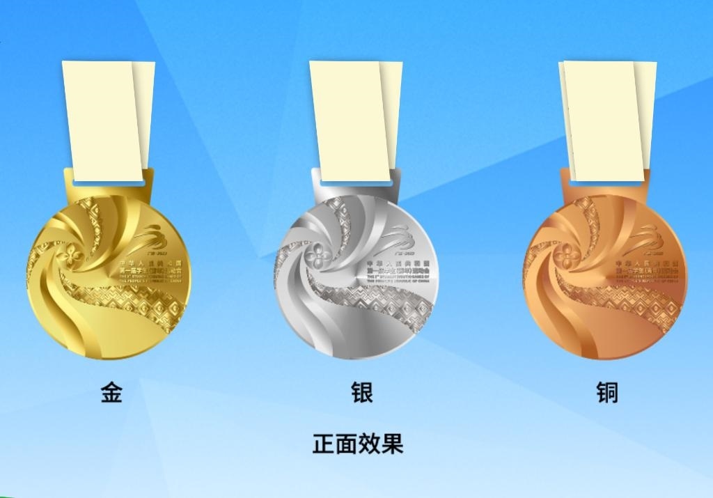 首屆學(xué)青會獎牌正面采用繡球、壯錦等廣西元素,以繡球為設(shè)計焦點,通過壯錦飄帶向外綻放,如一朵盛開的鮮花,表達(dá)歡迎四方友人共赴學(xué)青盛會的美意;獎牌背面以廣西銅鼓鼓面為原型,中心太陽紋象征著年輕人的活力和熱情,四方配以圖騰鳥,有著吉祥的寓意;外圈環(huán)繞了學(xué)青會的英文名稱和銅鼓經(jīng)典紋飾云雷紋。獎牌整體寓意“團(tuán)結(jié)、活力、綻放”。
