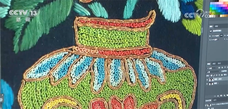經(jīng)由高清設(shè)備采集、原樣分析、線圖提取,絲綢紋樣的圖案、色彩、針法、層級(jí)都在電腦屏幕上一覽無(wú)遺。