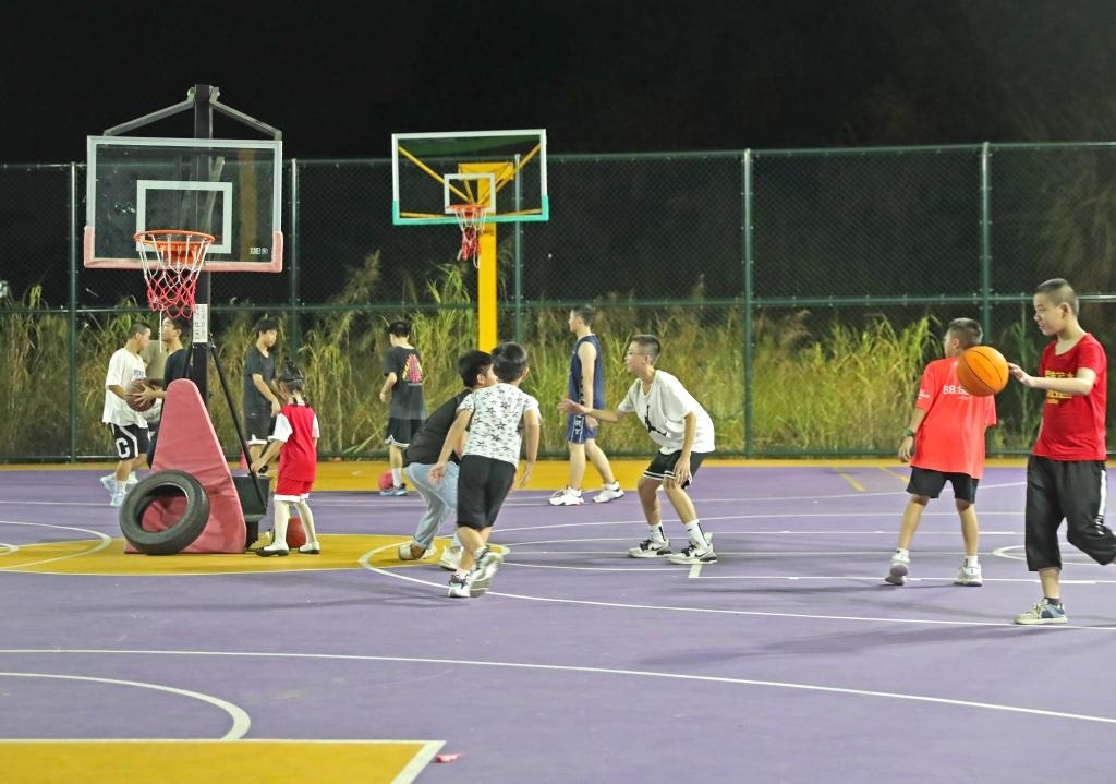 2023年7月5日,孩子們?cè)谀蠈庣呓呉粋€(gè)籃球場(chǎng)打球。新華社記者 周華 攝