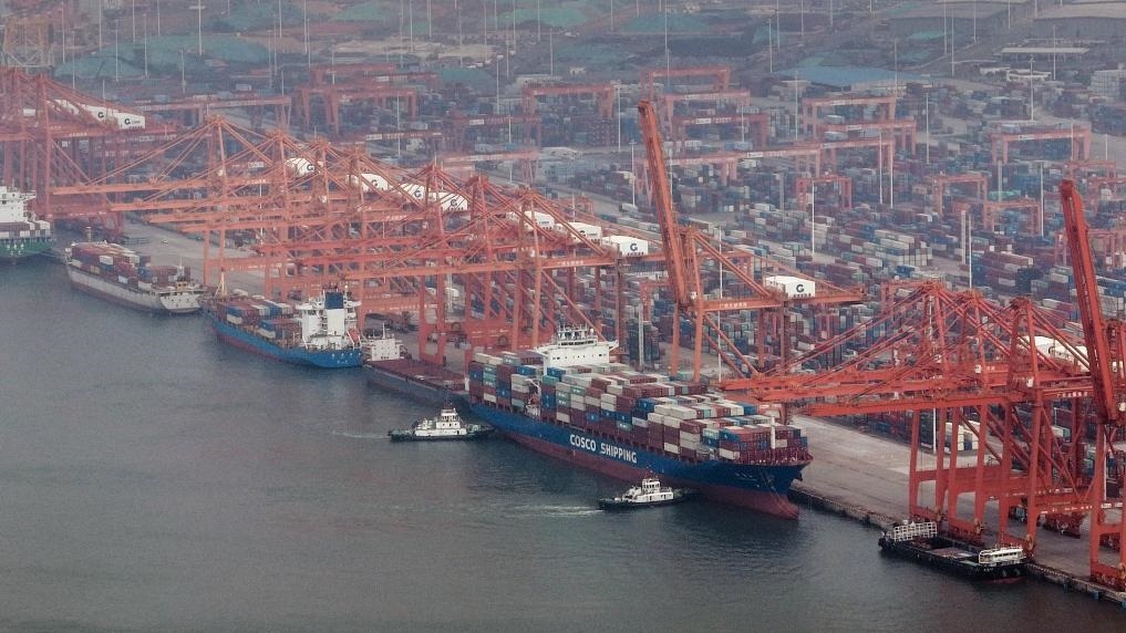 10月26日,在欽州港集裝箱裝卸碼頭,海事船正在協(xié)助海輪離岸(無(wú)人機(jī)照片)。新華社記者 張愛(ài)林 攝