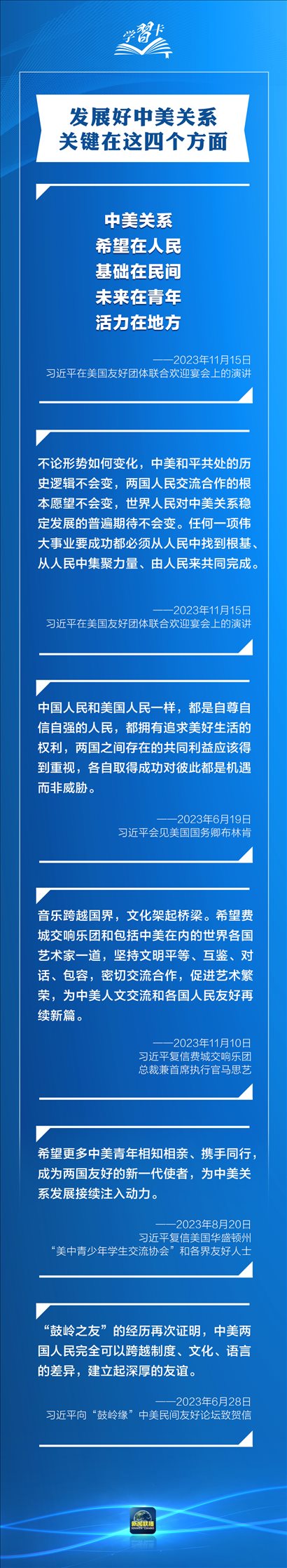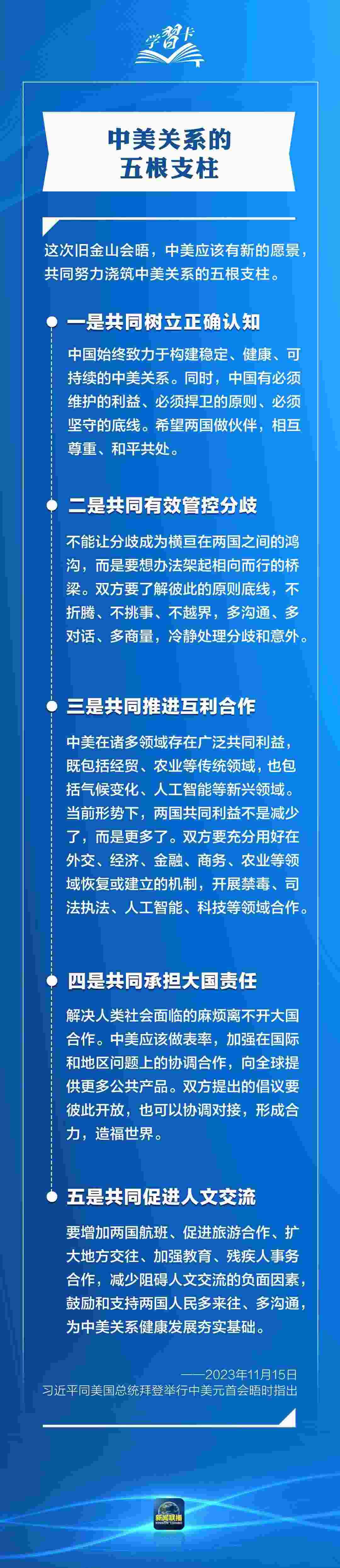 習(xí)近平多次指出,作為兩個世界大國,中美能否確立正確相處之道,攸關(guān)世界和平發(fā)展和人類前途命運。發(fā)展中美關(guān)系,習(xí)主席強(qiáng)調(diào)三點原則、四個方面、五根支柱,一起學(xué)習(xí)→