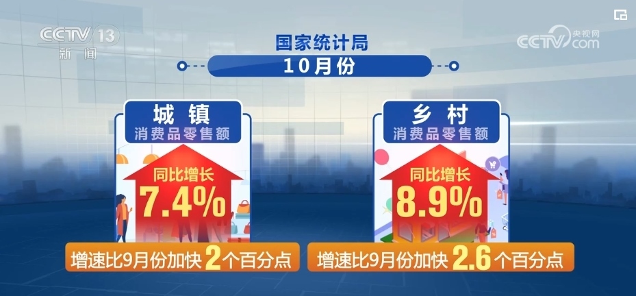 國家統(tǒng)計局最新數(shù)據顯示,在縣鄉(xiāng)消費市場基礎設施不斷完善、有效供給持續(xù)擴大等有利條件帶動下,鄉(xiāng)村市場銷售增速快于城鎮(zhèn)。10月份,城鎮(zhèn)、鄉(xiāng)村消費品零售額同比分別增長7.4%和8.9%,增速比9月份分別加快2和2.6個百分點。