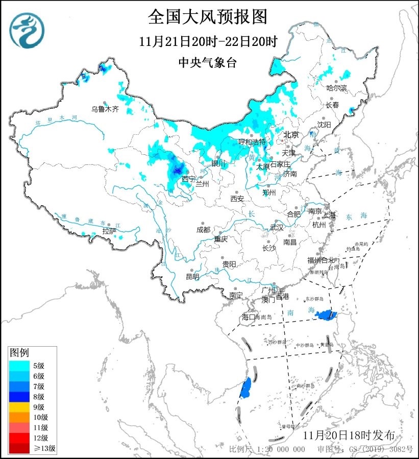 11月21日20時(shí)至22日20時(shí),新疆北部、內(nèi)蒙古大部、甘肅西北部、青海北部、寧夏北部、陜西北部、山西大部、河北西部、黑龍江西部、吉林東部等地部分地區(qū)將有5~6級(jí)、陣風(fēng)7~8級(jí)的大風(fēng);巴士海峽、南海中東部和西南部海域?qū)⒂?~8級(jí)、陣風(fēng)9級(jí)的大風(fēng)。