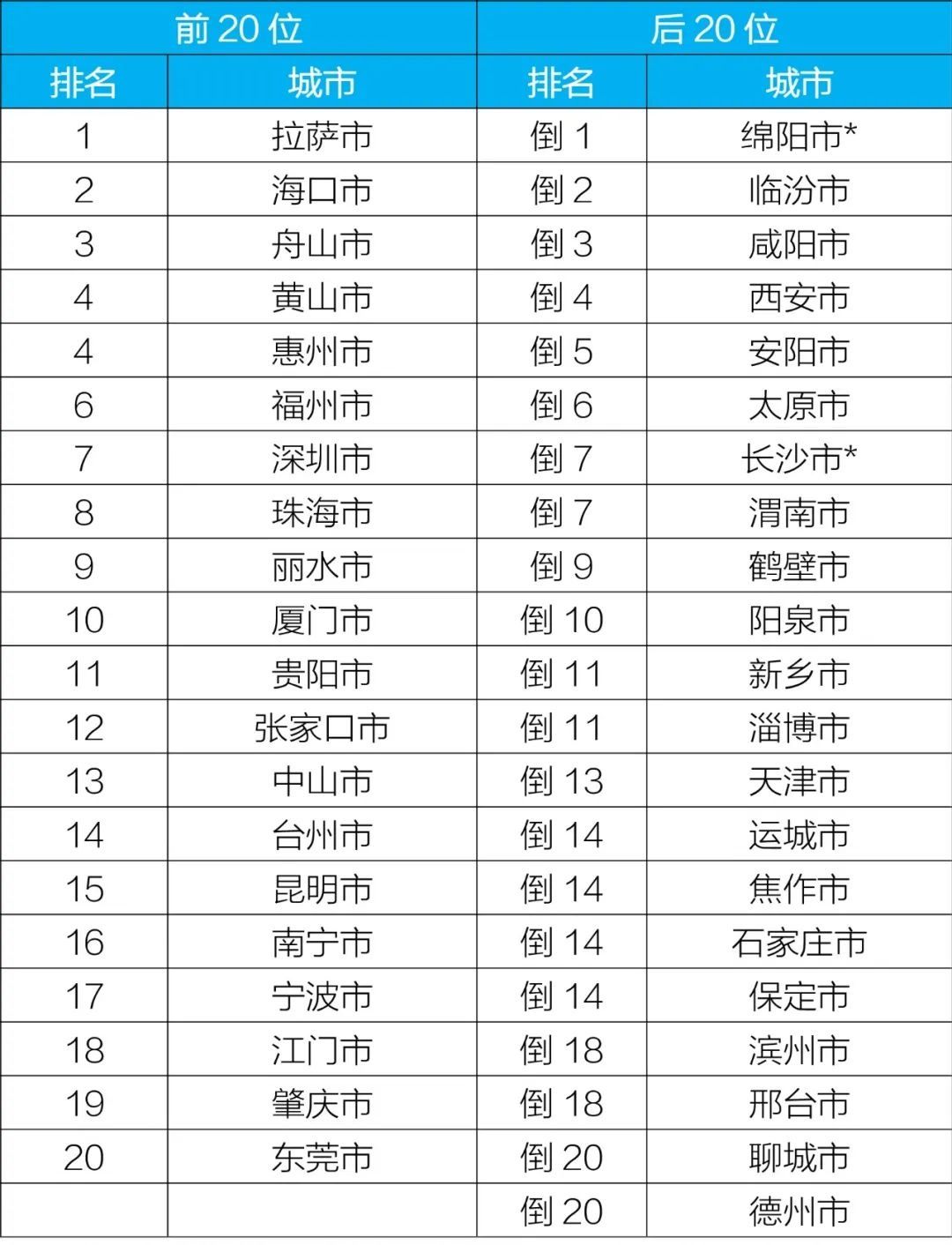 1—10月,168個重點(diǎn)城市中,空氣質(zhì)量排名前20位城市依次是拉薩、??诤椭凵降瘸鞘校◤牡?名至第20名);空氣質(zhì)量排名后20位城市依次是綿陽、臨汾和咸陽等城市(從倒數(shù)第1名至并列倒數(shù)第20名)。其中,綿陽市科技城新區(qū)的高新區(qū)自來水公司站點(diǎn)4月和5月、長沙市開福區(qū)的伍家?guī)X站點(diǎn)6月受到嚴(yán)重人為干擾,對所在城市當(dāng)月六項污染物濃度進(jìn)行了最大值替代處理。見附表2。