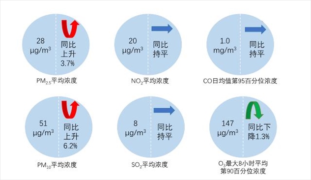 1—10月,全國339個地級及以上城市平均空氣質(zhì)量優(yōu)良天數(shù)比例為85.1%,同比下降1.2個百分點(diǎn),較2019年同期上升2.9個百分點(diǎn);平均重度及以上污染天數(shù)比例為1.6%,同比上升0.8個百分點(diǎn),較2019年同期下降0.1個百分點(diǎn);PM2.5平均濃度為28微克/立方米,同比上升3.7%,較2019年同期下降17.6%;O3平均濃度為147微克/立方米,同比下降1.3%,較2019年同期下降2.6%;PM10平均濃度為51微克/立方米,同比上升6.2%;SO2平均濃度為8微克/立方米,同比持平;NO2平均濃度為20微克/立方米,同比持平;CO平均濃度為1.0毫克/立方米,同比持平。