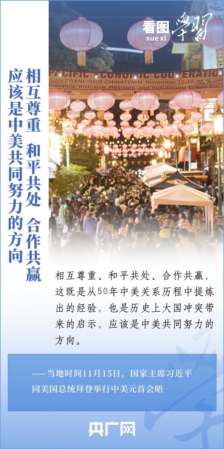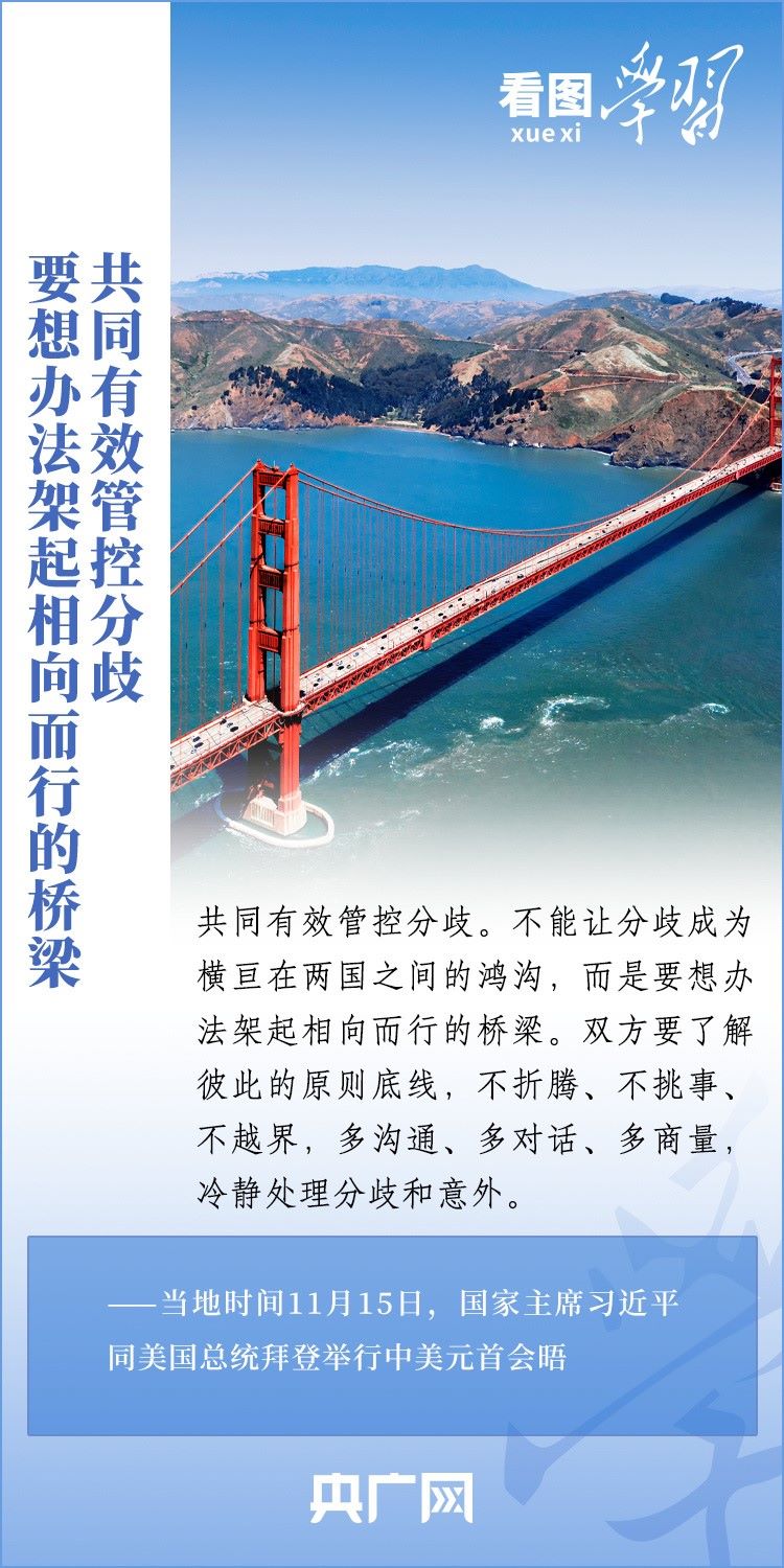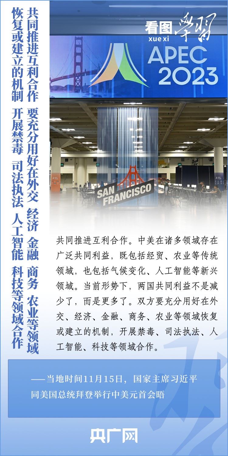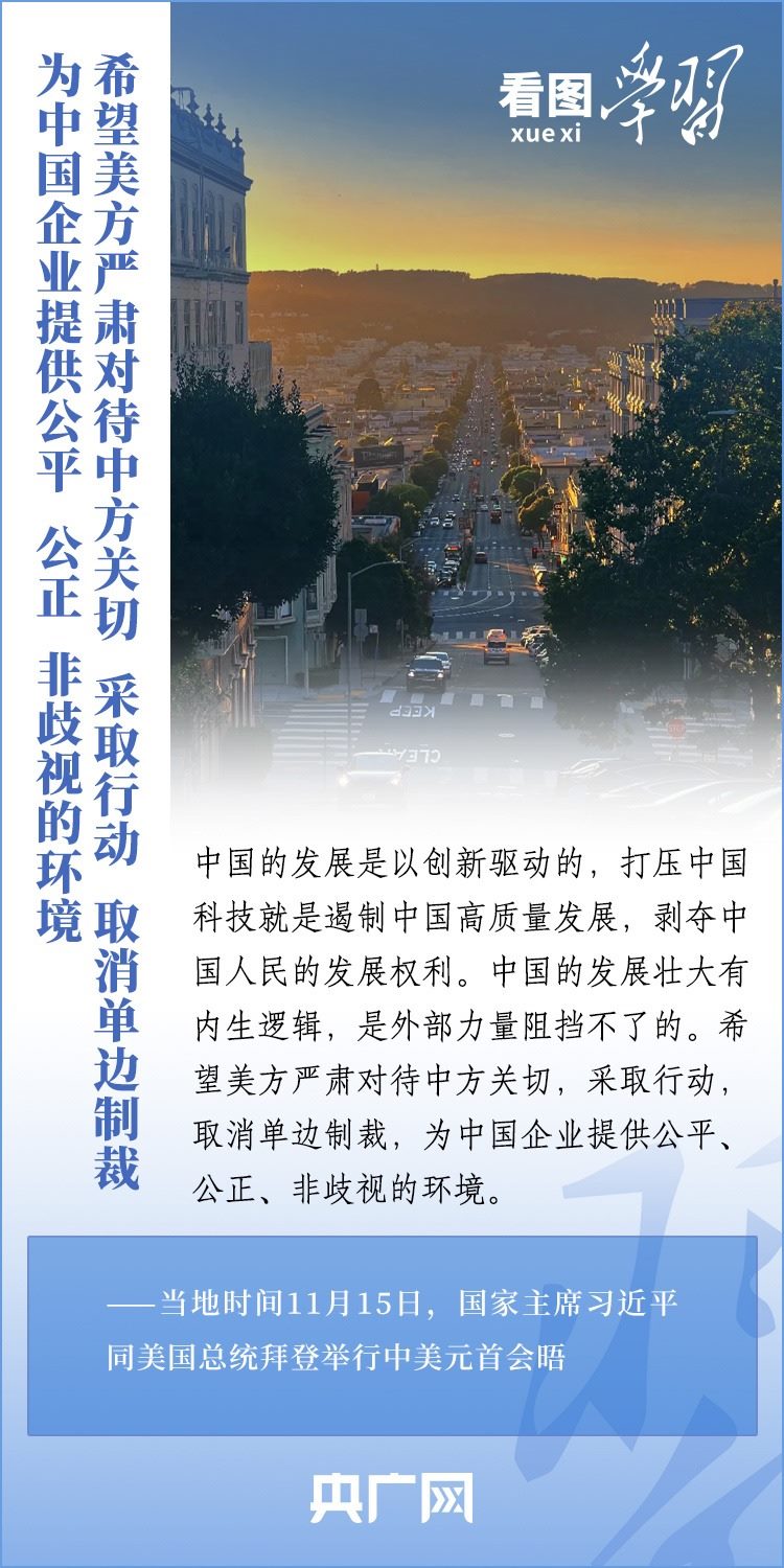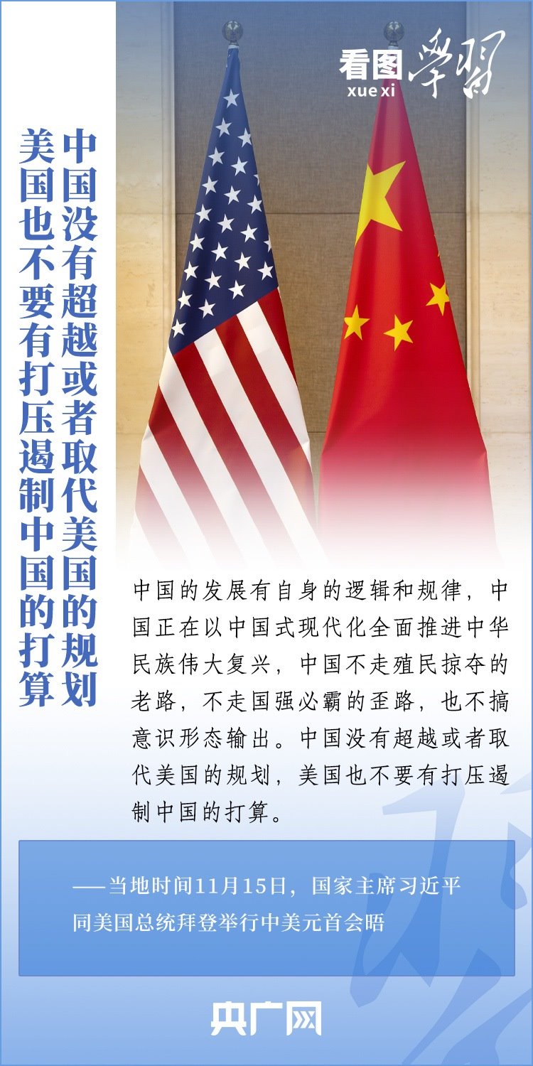 當(dāng)?shù)貢r(shí)間11月15日,國家主席習(xí)近平在美國舊金山斐洛里莊園同美國總統(tǒng)拜登舉行中美元首會晤。兩國元首就事關(guān)中美關(guān)系的戰(zhàn)略性、全局性、方向性問題以及事關(guān)世界和平和發(fā)展的重大問題坦誠深入地交換了意見。習(xí)近平主席指出,大國競爭解決不了中美兩國和世界面臨的問題。這個地球容得下中美兩國。中美各自的成功是彼此的機(jī)遇。一起來學(xué)習(xí)!